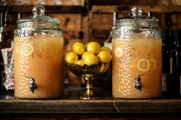 You can put big dispensers glass, to make it look good kind of drink that is inside. Here you can use juices, flavored water, lemonade, iced...You can serve with fruit or flowers. You can put in rustic or vintage furniture and the result will be great. Don't forget to put a sign with in each dispenser so that your guests don't have doubts about what they are drinking.